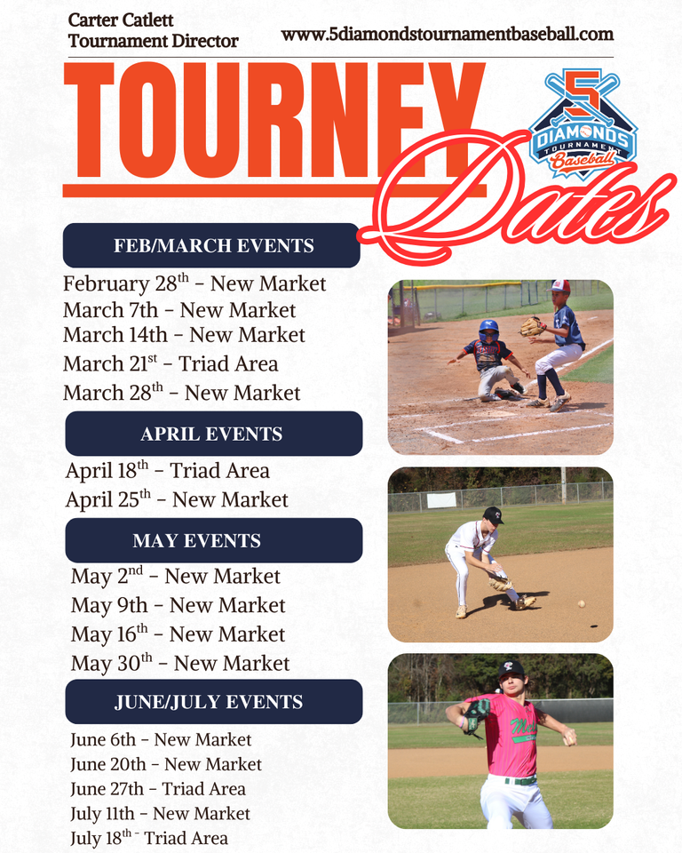For more information on our tournaments please call or text Tournament Director Carter Catlett at 336-736-6044 or email him at Carter@5diamondstournamentbaseball.com.