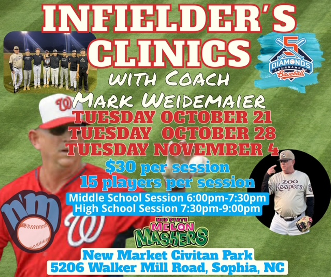 We are excited to offer three nights of "Infielder's Clinics" with Coach Mark Weidemaier this fall. Coach Wiedemaier has over 40 years professional baseball experience and has a passion for teaching defense. Wiedemaier has coached on the major league level with the Washington Nationals and is currently the Head Coach of the Asheboro Zookeepers in the Coastal Plains League.